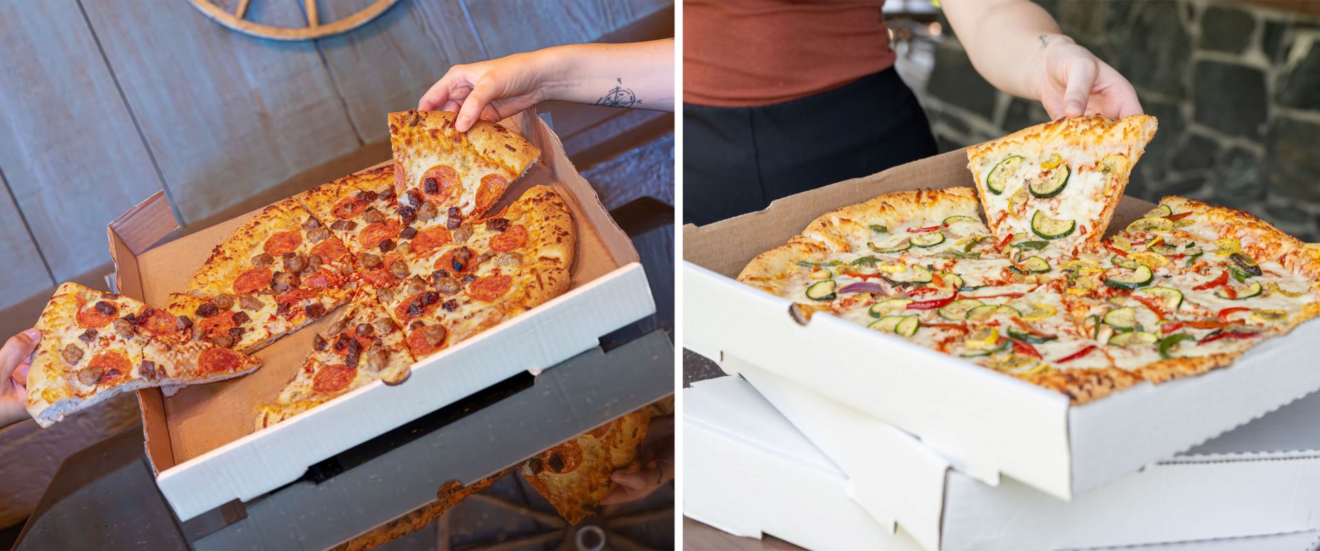 Veg Out: Seasonal veggies, mushrooms, red onion, mozzarella, gorgonzola, and red sauce dollops