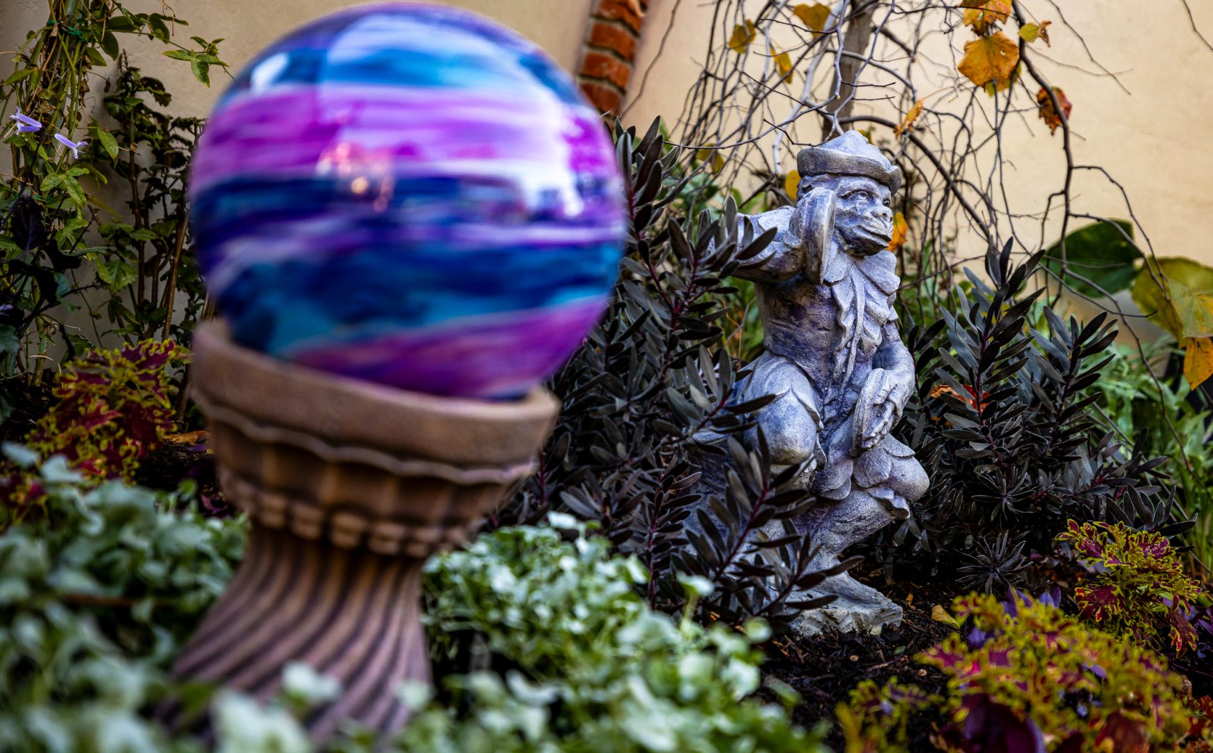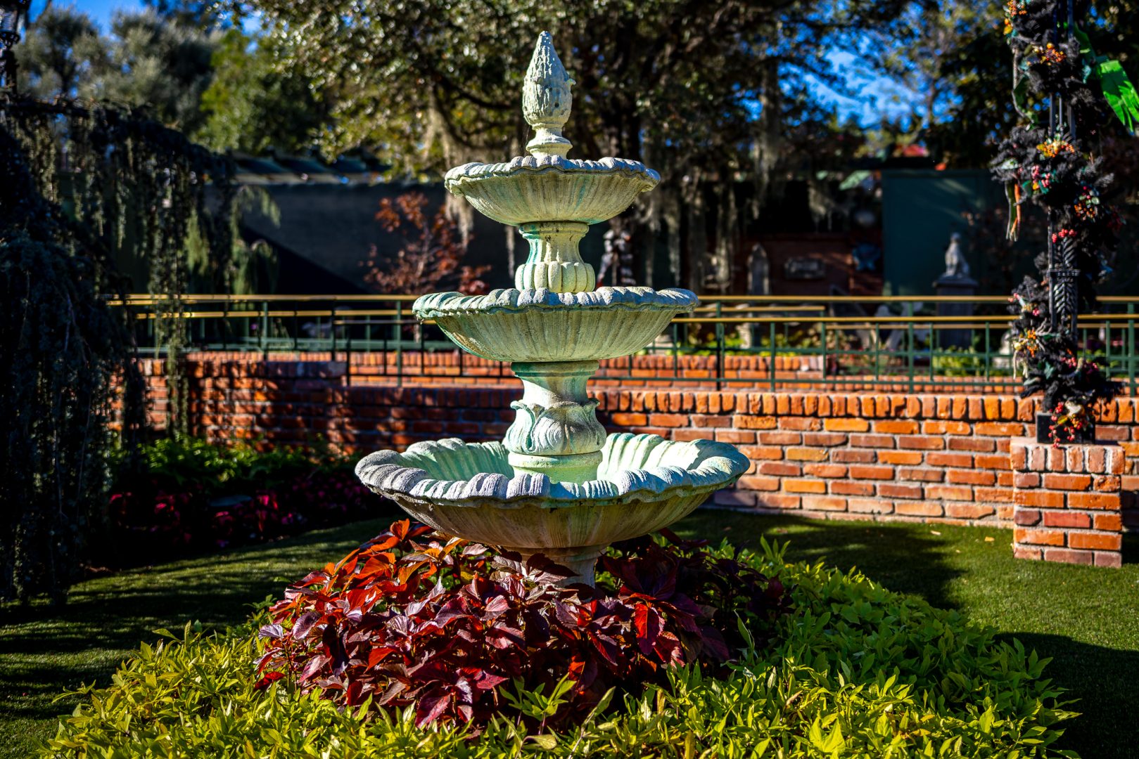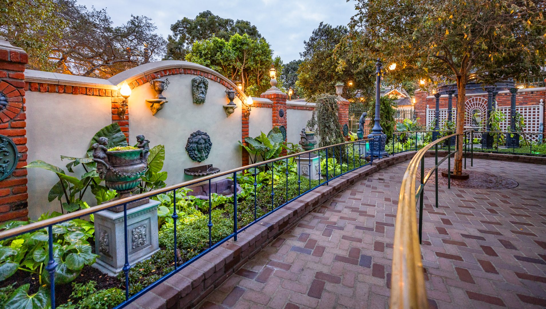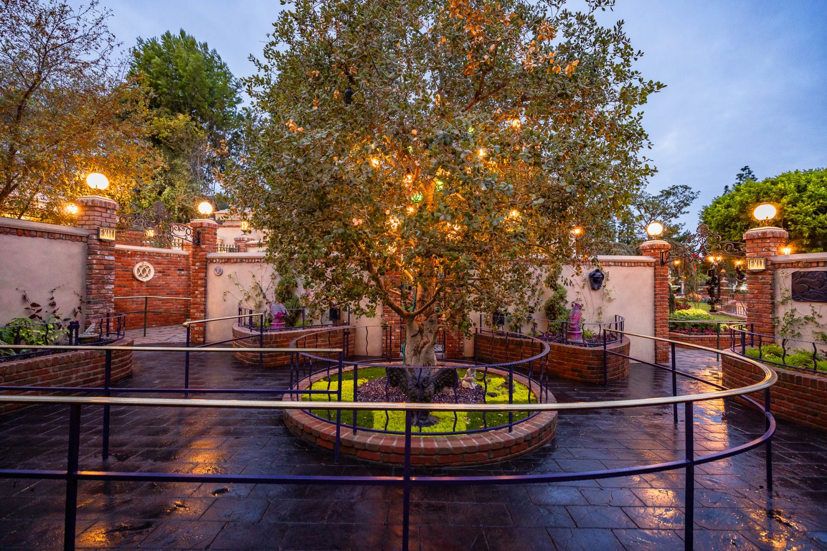 Further along the path, you’ll find the eccentric garden of Madame Leota, the resident Seer. It seems as if the entire garden is dipped in a mystical energy; as if every plant, statue, and trinket is under Leota’s spell. There is a small statuary of oddities – frogs, lizards, rats and a cymbal-playing monkey – all frozen in time like they are under an incantation. The garden has a repeating motif of fortune-telling orbs. The large oak tree that graces the center of the courtyard has been decorated by Leota with colorful ornaments, chimes and bells that ring out in the breeze.