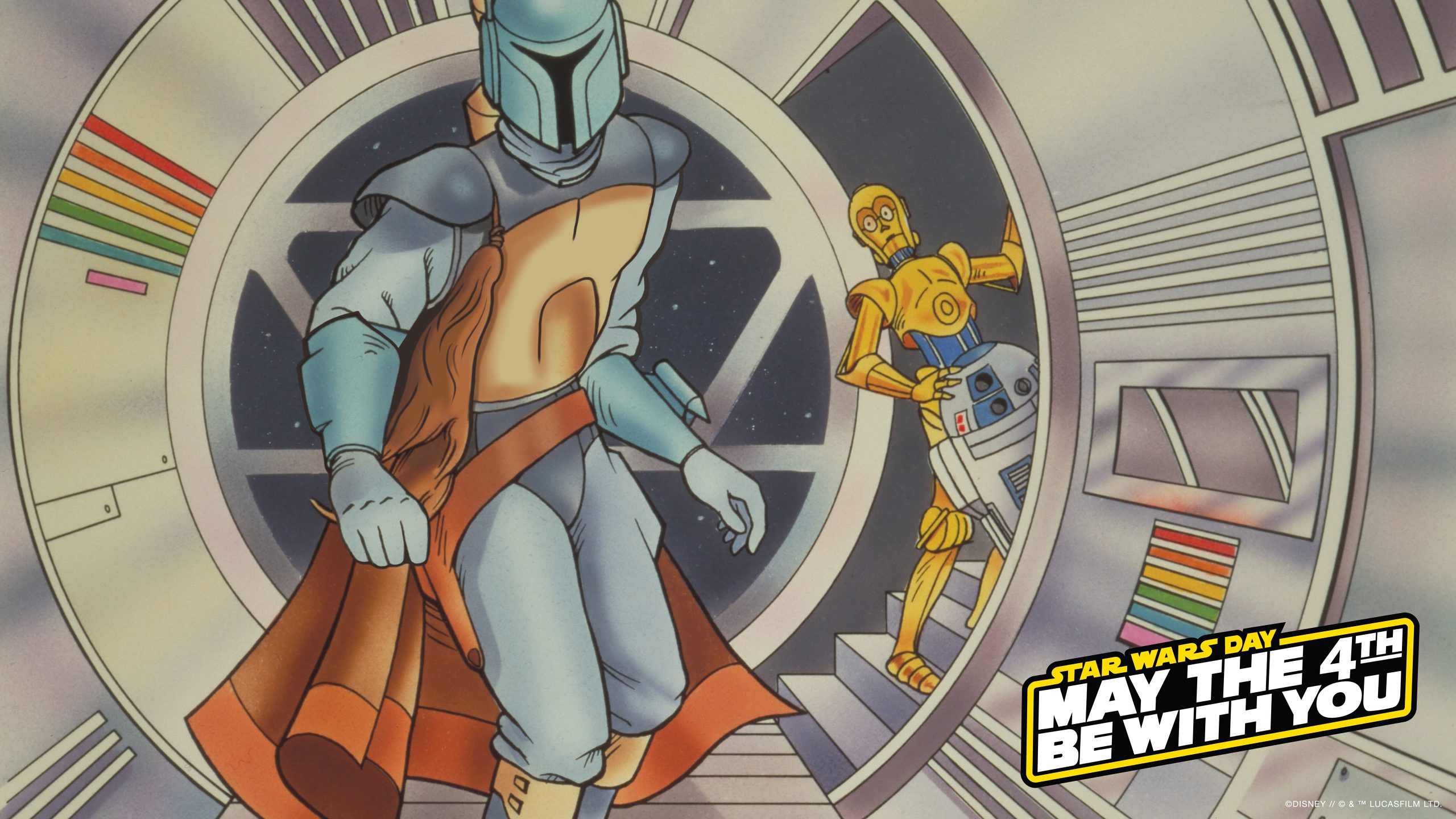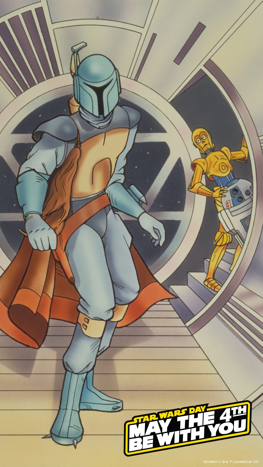 Finishing up our stellar lineup is a wallpaper featuring Boba Fett, with a special cameo from the much-loved duo, C-3PO and R2-D2.
