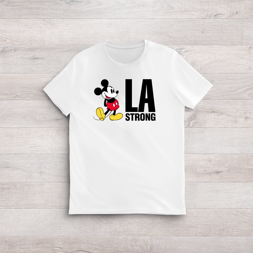 The design is minimalist yet meaningful: the iconic Mickey Mouse, is paired with bold, straightforward LA Strong lettering in either black or white. It’s a tribute to the Los Angeles community’s resilience—their strength, spirit, and ultimately their ability to rise from adversity.