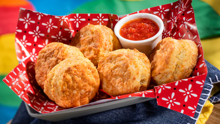 Happy anniversary to Roundup Rodeo BBQ in Toy Story Land at Disney’s Hollywood Studios! Tomorrow, March 23, marks one year since the opening and to celebrate, we’re sharing an exclusive, fan-favorite recipe with you – The Prospector’s Homemade Cheddar Biscuits with Sweet Pepper Jelly.
